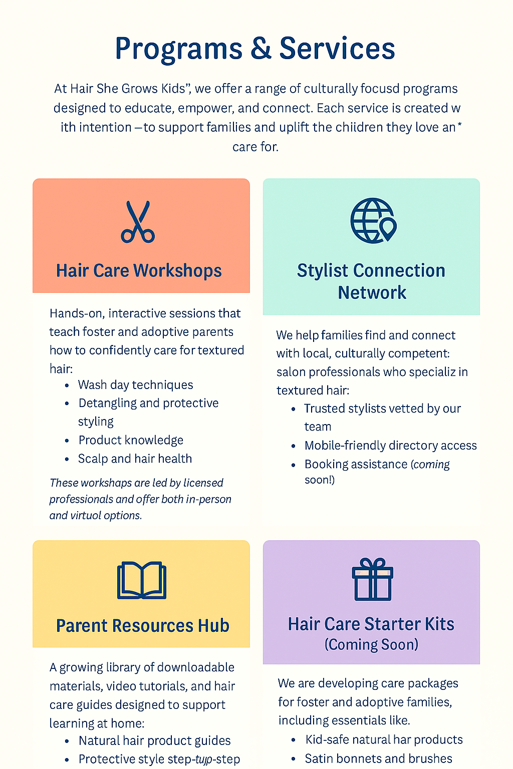 We are honored to welcome you to Hair She Grows Kids®, a nonprofit organization dedicated to supporting foster, adopted and all families of multicultural children. Our mission is to provide culturally responsive hair care education and connect families with professional resources to ensure every child feels confident, cared for, and celebrated.