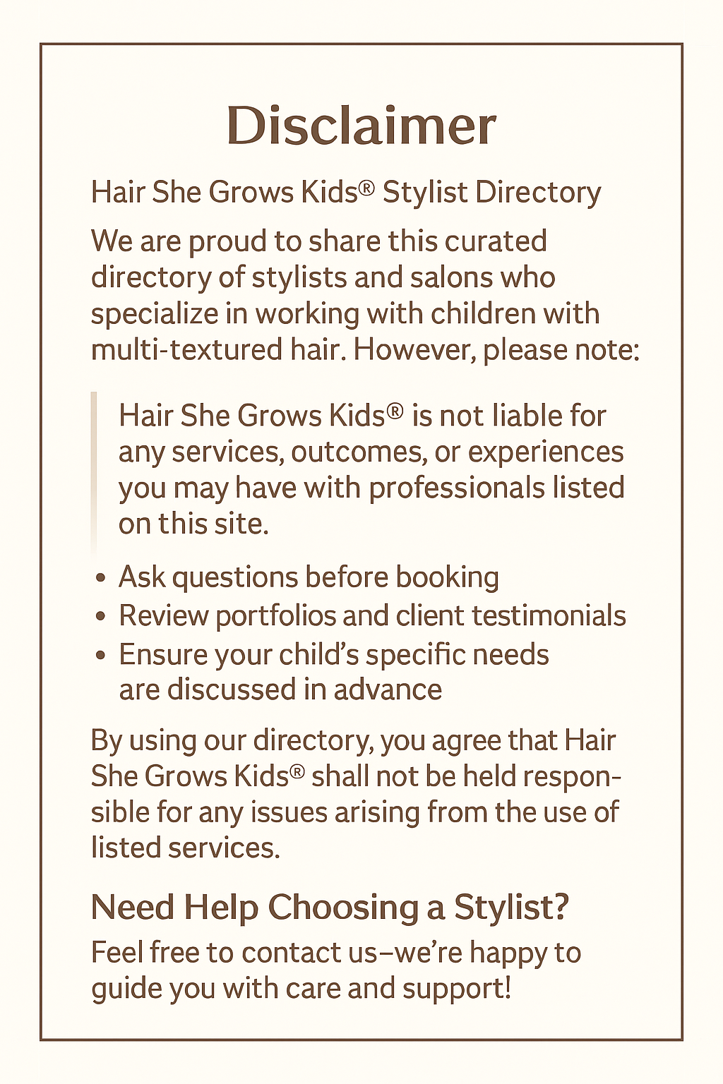 Welcome to our national directory of hairstylists and salons who specialize in nurturing the hair of multi textured children—curly, coily, kinky, and wavy textures included! Whether you're a foster parent, adoptive parent, or caregiver, we help you connect with trusted professionals who celebrate and care for every strand.